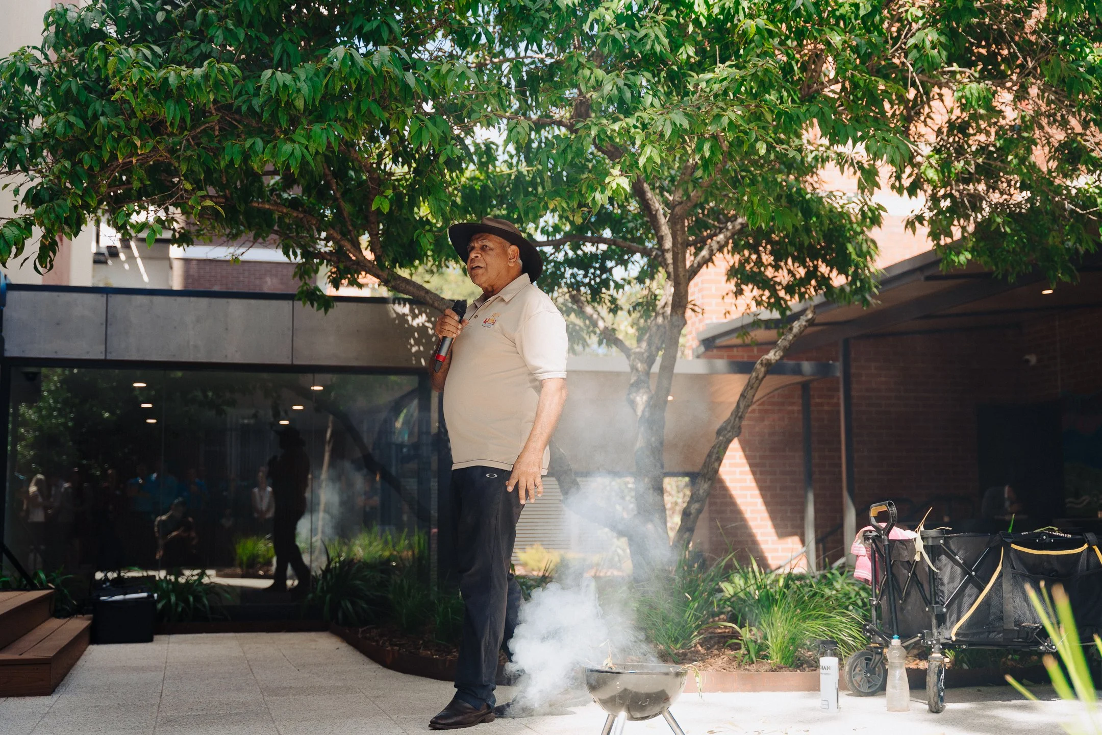 A smoking ceremony led by Nick Abraham of Warrang-Bridil set a meaningful tone for the event, offering a traditional welcome and cleansing of the space. The ceremony underscored the significance of connection to Country, which is also reflected in the Centre’s newly unveiled Aboriginal artwork by Kevin Bynder of Mardaa.