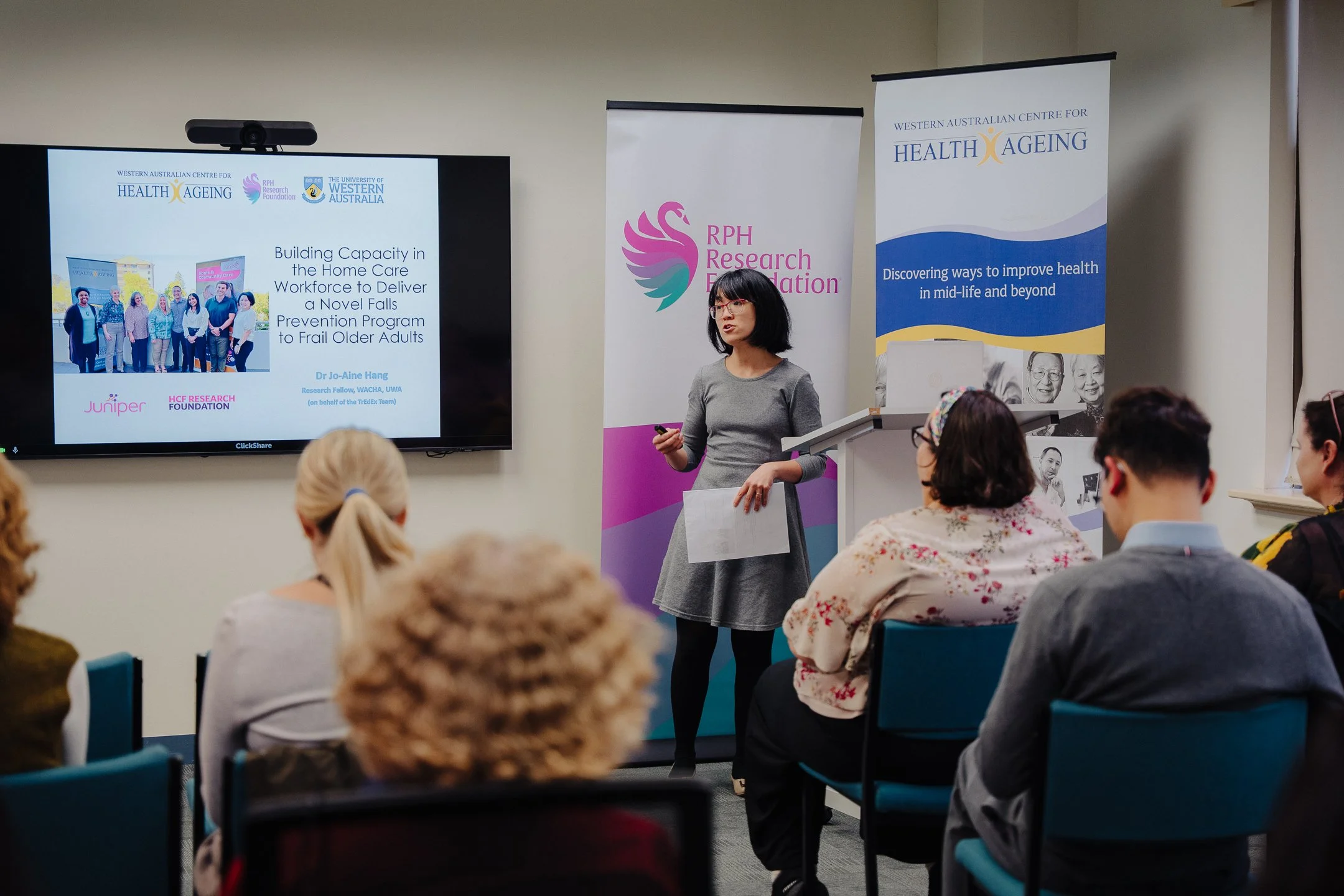 Dr Jo-Aine Hang, PhD – Postdoctoral Fellow, UWA School of Allied Health, WACHA; Lecturer, The University of Notre Dame Australia; and Senior Physiotherapist in Gerontology. Dr Hang presented on the TrEdEx project, which focuses on training community healthcare staff to deliver a novel falls prevention program comprising validated education and exercise modules.
